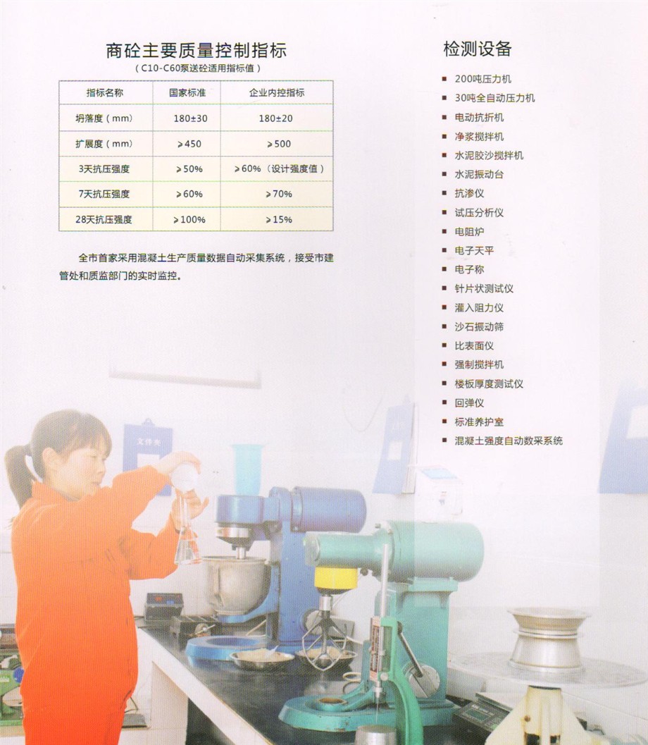 公司設(shè)有先進的實驗室,配備全套混凝土及原材料檢測試驗設(shè)備,配有專職的試驗、檢驗人員,可承擔(dān)混凝土的材料性能試驗,工藝質(zhì)量控制、產(chǎn)品質(zhì)量檢驗等全部試驗、檢驗項目,為確保混凝土質(zhì)量提供了可靠的保證。